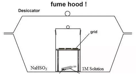 一個簡易的替代方法是,打破一個含有餓酸晶體的安瓿瓶,把它同樣品一起放在培養(yǎng)皿里,蓋上蓋子后放在干燥器里面,取出干燥器里面的硅膠,加入一定量的1M NaHSO3溶液。整個干燥器放在通風(fēng)櫥里染色過夜,一般染色16小時左右會獲得比較理想的結(jié)果。