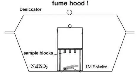 如果沒有餓酸晶體,只有2%的餓酸溶液,染色方法如下:把樣品塊用雙面膠粘在一個10 ml 的玻璃小瓶上部,加入2% 的餓酸溶液,蓋上蓋子,放在干燥器里,取出干燥器里面的硅膠,加入一定量的1M NaHSO3溶液,整個干燥器放在通風(fēng)櫥里染色過夜。(注意:使用溶液會非常臟,所有東西都會被沾上有毒的餓酸)