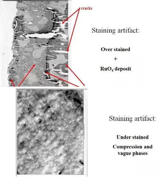 對于橡膠類材料如ABS,Epoxies, HIPS等,或者含有這些材料的混合物,應(yīng)該先用OsO4蒸汽或者水溶液染色,之后再進(jìn)行RuO4染色。