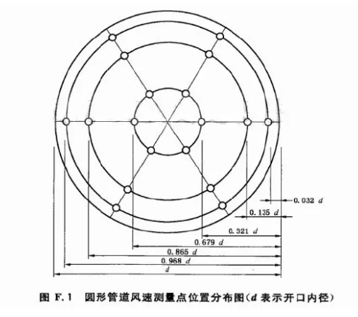 1) YY0569-2011中,測試步驟和方法指出,用風(fēng)速儀插入至附錄圖F.1中的測量點(diǎn)位置,然后算出安全柜的排氣流量。對口徑≤254mm的圓管,3個(gè)或2個(gè)軸,每個(gè)軸上有6個(gè)測點(diǎn);口徑>254mm的圓管,3個(gè)或2個(gè)軸,每個(gè)軸有8或10個(gè)測量點(diǎn)。再測得安全柜的供氣流量,最后算出進(jìn)氣流速。