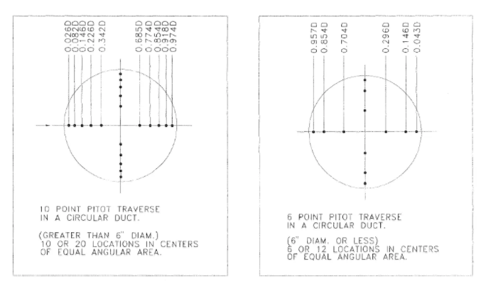 2)而NSF49-2018中,指出需要參考“Industrial Ventilation-Testing of Ventilation Systems”用皮托管的方法測量。按照管道直徑,對大于6英寸的管道,2個(gè)軸,每個(gè)軸10或20個(gè)點(diǎn);對小于6英寸的管道,2個(gè)軸,每個(gè)軸6個(gè)點(diǎn)或者12個(gè)點(diǎn)。把皮托管按照測量點(diǎn)放入管道,通過得到的動壓值得到通過管道橫截面的風(fēng)速,在通過測量供氣流量計(jì)算得出進(jìn)氣風(fēng)速。