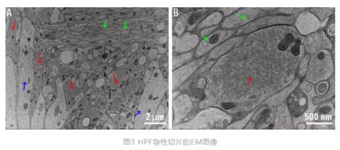 “閃光冷凍”電鏡的拍攝的HPF小鼠急性腦片海馬CA3區(qū)圖像如下:A)低倍鏡圖像顯示青苔狀纖維軸突(綠色箭頭)穿過透明層,CA3錐體神經(jīng)元樹突(藍色箭頭)穿過青苔狀纖維,少量青苔狀纖維(紅色箭頭)位于這些樹突和軸突之間。B)高倍鏡圖像顯示苔蘚纖維(紅色箭頭)布滿突觸囊泡和苔蘚纖維軸突(綠色箭頭)。優(yōu)化后的實驗體系保留了急性切片最佳超微結(jié)構(gòu),可媲美無光遺傳學刺激的HPF類器官腦片的超微結(jié)構(gòu)。