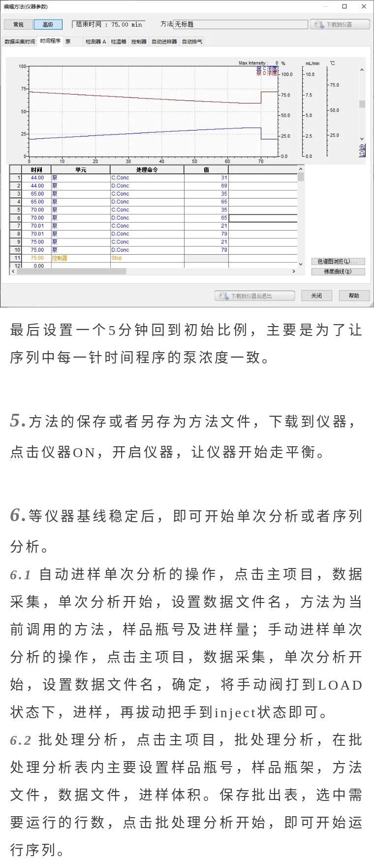 假設(shè)流動(dòng)相A放在C通道,流動(dòng)相B放在D通道,先點(diǎn)擊泵,泵C濃度設(shè)置成21,泵D濃度設(shè)置成79,再點(diǎn)擊時(shí)間程序,如下表設(shè)置: