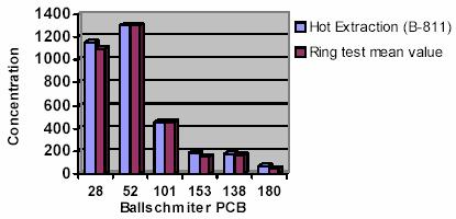我們比較了采用 Buchi B-811 萃取儀(熱萃取模式)和采用索氏標(biāo)準(zhǔn)法進(jìn)行淤泥中的PCB 和PCDD/F 測(cè)定。在測(cè)定PCB 時(shí)我們采用標(biāo)準(zhǔn)淤泥(0.1-0.4mg/kg),并采用環(huán)形測(cè)試材料(0.07-1.2mg/kg)。淤泥中的毒素含量約為46ng TEQ/kg。我們比較了采用兩種不同的方法,索氏標(biāo)準(zhǔn)法和熱萃取法進(jìn)行對(duì)比。采用Buchi公司的B-811萃取儀中的熱萃取模式可以大大縮短萃取時(shí)間,減少所需要的溶劑量,并且溶劑可以重復(fù)使用至少3-4次,大大提高了效率,節(jié)約了成本。